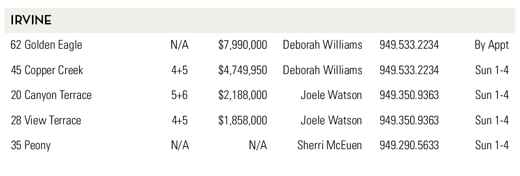 IRVINE 62 Golden Eagle N/A $7,990,000 Deborah Williams 949.533.2234 By Appt 45 Copper Creek 4+5 $4,749,950 Deborah Williams 949.533.2234 Sun 1-4 20 Canyon Terrace 5+6 $2,188,000 Joele Watson 949.350.9363 Sun 1-4 28 View Terrace 4+5 $1,858,000 Joele Watson 949.350.9363 Sun 1-4 35 Peony N/A N/A Sherri McEuen 949.290.5633 Sun 1-4