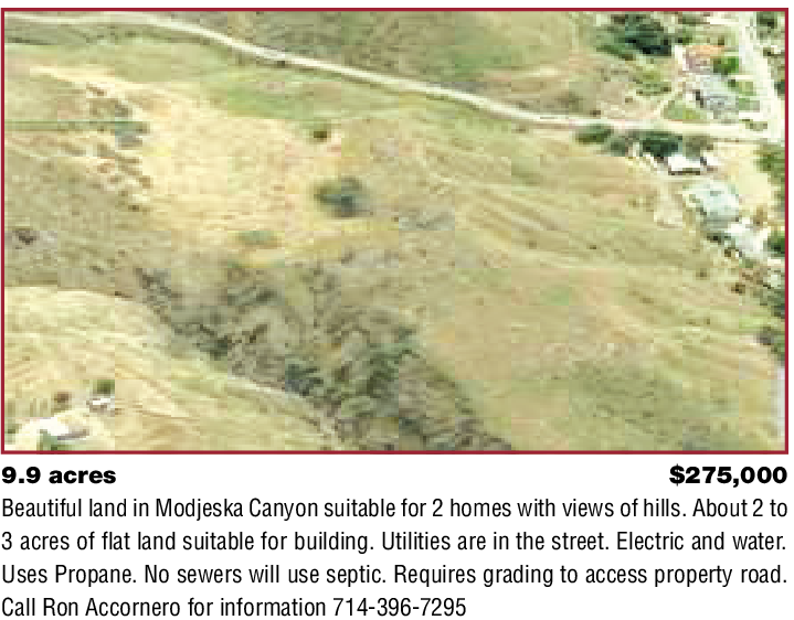 9.9 acres $275,000 Beautiful land in Modjeska Canyon suitable for 2 homes with views of hills. About 2 to 3 acres of flat land suitable for building. Utilities are in the street. Electric and water. Uses Propane. No sewers will use septic. Requires grading to access property road. Call Ron Accornero for information 714-396-7295