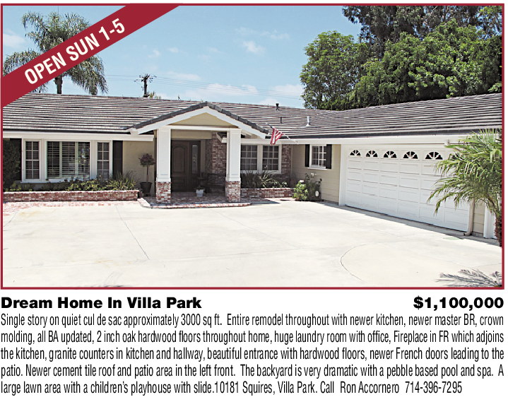 Dream Home In Villa Park $1,100,000 Single story on quiet cul de sac approximately 3000 sq ft. Entire remodel throughout with newer kitchen, newer master BR, crown molding, all BA updated, 2 inch oak hardwood floors throughout home, huge laundry room with office, Fireplace in FR which adjoins the kitchen, granite counters in kitchen and hallway, beautiful entrance with hardwood floors, newer French doors leading to the patio. Newer cement tile roof and patio area in the left front. The backyard is very dramatic with a pebble based pool and spa. A large lawn area with a children’s playhouse with slide.10181 Squires, Villa Park. Call Ron Accornero 714-396-7295