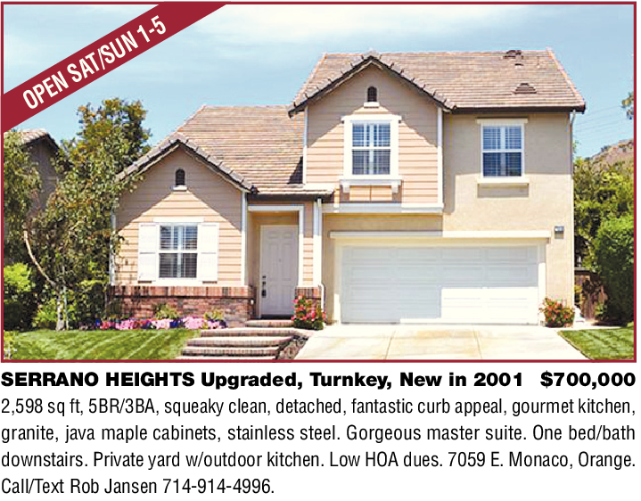 SERRANO HEIGHTS Upgraded, Turnkey, New in 2001 $700,000 2,598 sq ft, 5BR/3BA, squeaky clean, detached, fantastic curb appeal, gourmet kitchen, granite, java maple cabinets, stainless steel. Gorgeous master suite. One bed/bath downstairs. Private yard w/outdoor kitchen. Low HOA dues. 7059 E. Monaco, Orange. Call/Text Rob Jansen 714-914-4996.