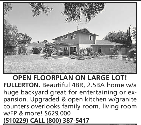 FULLERTON. Beautiful 4BR, 2.5BA home w/a huge backyard great for entertaining or expansion. Upgraded & open kitchen w/granite counters overlooks family room, living room w/FP & more! $629,000 (510229) CALL (800) 387-5417