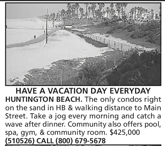HAVE A VACATION DAY EVERYDAY HUNTINGTON BEACH. The only condos right on the sand in HB & walking distance to Main Street. Take a jog every morning and catch a wave after dinner. Community also offers pool, spa, gym, & community room. $425,000 (510526) CALL (800) 679-5678