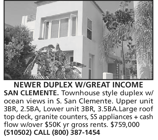 NEWER DUPLEX W/GREAT INCOME SAN CLEMENTE. Townhouse style duplex w/ ocean views in S. San Clemente. Upper unit 3BR, 2.5BA, Lower unit 3BR, 3.5BA.Large roof top deck, granite counters, SS appliances + cash flow w/over $50K yr gross rents. $759,000 (510502) CALL (800) 387-1454