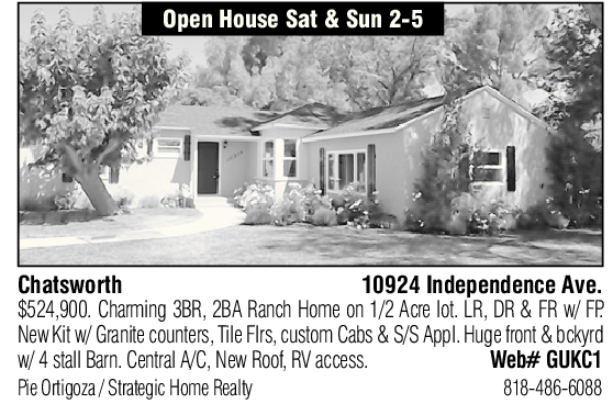 Open House Sat & Sun 2-5 Chatsworth 10924 Independence Ave. New Kit w/ Granite counters, Tile Flrs, custom Cabs & S/S Appl. Huge front & bckyrd $524,900. Charming 3BR, 2BA Ranch Home on 1/2 Acre lot. LR, DR & FR w/ FP. w/ 4 stall Barn. Central A/C, New Roof, RV access. Web# GUKC1 Pie Ortigoza / Strategic Home Realty 818-486-6088