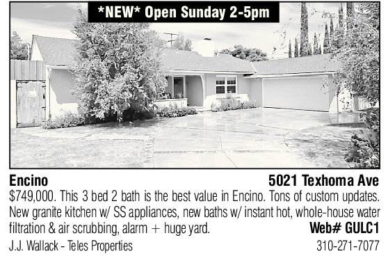*NEW* Open Sunday 2-5pm Encino 5021 Texhoma Ave New granite kitchen w/ SS appliances, new baths w/ instant hot, whole-house water $749,000. This 3 bed 2 bath is the best value in Encino. Tons of custom updates. filtration & air scrubbing, alarm + huge yard. Web# GULC1 J.J. Wallack - Teles Properties 310-271-7077