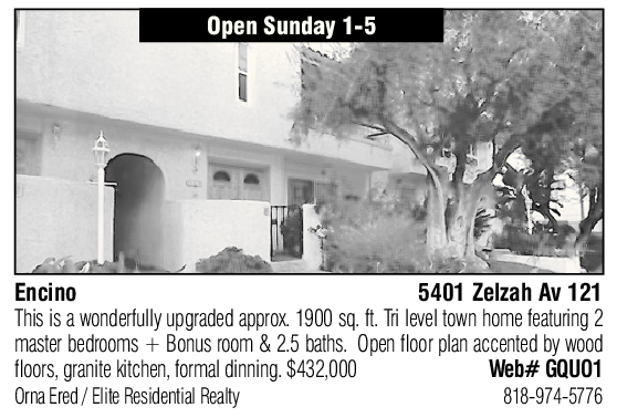 Encino 5401 Zelzah Av 121 This is a wonderfully upgraded approx. 1900 sq. ft. Tri level town home featuring 2 master bedrooms + Bonus room & 2.5 baths. Open floor plan accented by wood floors, granite kitchen, formal dinning. $432,000 Web# GQUO1 Orna Ered / Elite Residential Realty 818-974-5776