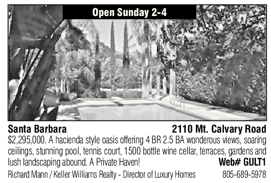Open Sunday 2-4 Santa Barbara 2110 Mt. Calvary Road $2,295,000. A hacienda style oasis offering 4 BR 2.5 BA wonderous views, soaring ceilings, stunning pool, tennis court, 1500 bottle wine cellar, terraces, gardens and lush landscaping abound. A Private Haven! Web# GULT1 Richard Mann / Keller Williams Realty - Director of Luxury Homes 805-689-5978 See also