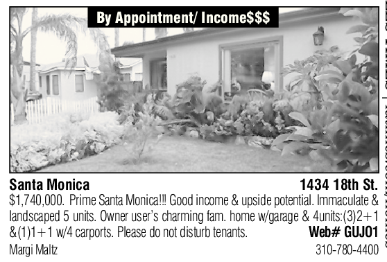 By Appointment/ Income$$$ Santa Monica 1434 18th St. $1,740,000. Prime Santa Monica!!! Good income & upside potential. Immaculate & landscaped 5 units. Owner user’s charming fam. home w/garage & 4units:(3)2+1 &(1)1+1 w/4 carports. Please do not disturb tenants. Web# GUJO1 Margi Maltz 310-780-4400