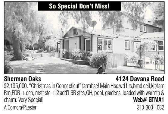 So Special Don’t Miss! Sherman Oaks 4124 Davana Road $2,195,000. “Christmas in Connecticut” farmhse! Main Hse:wd flrs,bmd ceil;kit/fam Rm,FDR +den; mstr ste +2 add’l BR stes;GH, pool, gardens. loaded with warmth & charm. Very Special! Web# GTMA1 A Comora/PLester 310-300-1082