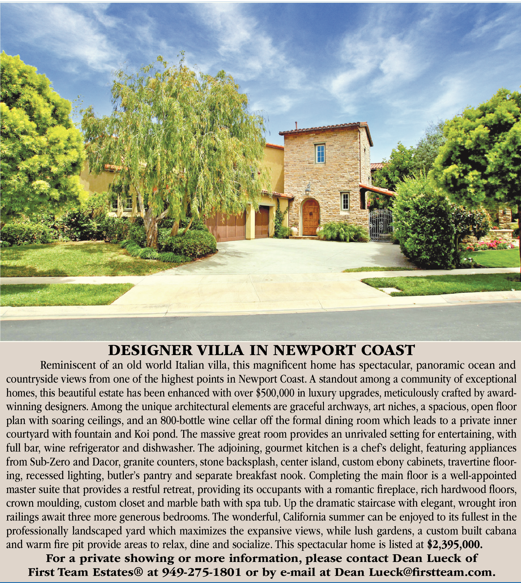Reminiscent of an old world Italian villa, this magnificent home has spectacular, panoramic ocean and countryside views from one of the highest points in Newport Coast. A standout among a community of exceptional homes, this beautiful estate has been enhanced with over $500,000 in luxury upgrades, meticulously crafted by awardwinning designers. Among the unique architectural elements are graceful archways, art niches, a spacious, open floor plan with soaring ceilings, and an 800-bottle wine cellar off the formal dining room which leads to a private inner courtyard with fountain and Koi pond. The massive great room provides an unrivaled setting for entertaining, with full bar, wine refrigerator and dishwasher. The adjoining, gourmet kitchen is a chef’s delight, featuring appliances from Sub-Zero and Dacor, granite counters, stone backsplash, center island, custom ebony cabinets, travertine flooring, recessed lighting, butler’s pantry and separate breakfast nook. Completing the main floor is a well-appointed master suite that provides a restful retreat, providing its occupants with a romantic fireplace, rich hardwood floors, crown moulding, custom closet and marble bath with spa tub. Up the dramatic staircase with elegant, wrought iron railings await three more generous bedrooms. The wonderful, California summer can be enjoyed to its fullest in the professionally landscaped yard which maximizes the expansive views, while lush gardens, a custom built cabana and warm fire pit provide areas to relax, dine and socialize. This spectacular home is listed at $2,395,000.