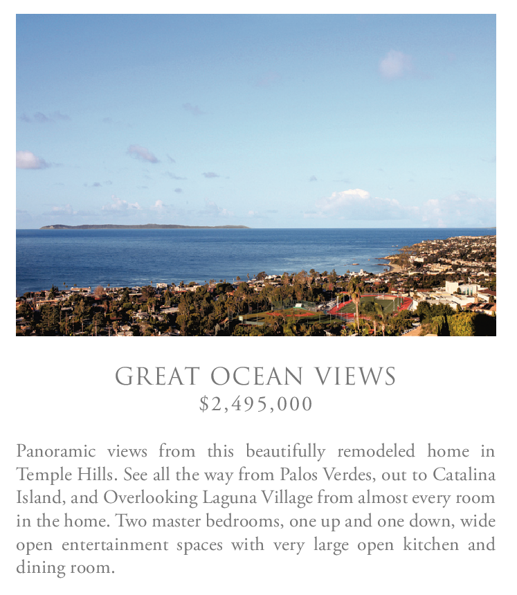 Panoramic views from this beautifully remodeled home in Temple Hills. See all the way from Palos Verdes, out to Catalina Island, and Overlooking Laguna Village from almost every room in the home. Two master bedrooms, one up and one down, wide open entertainment spaces with very large open kitchen and dining room.