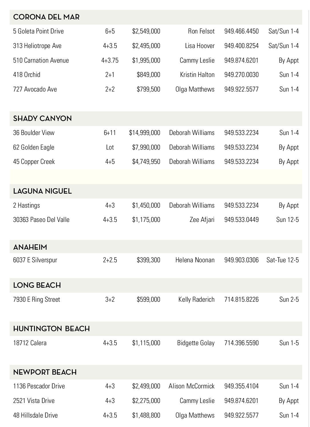 313 Heliotrope Ave 4+3.5 $2,495,000 Lisa Hoover 949.400.8254 Sat/Sun 1-4