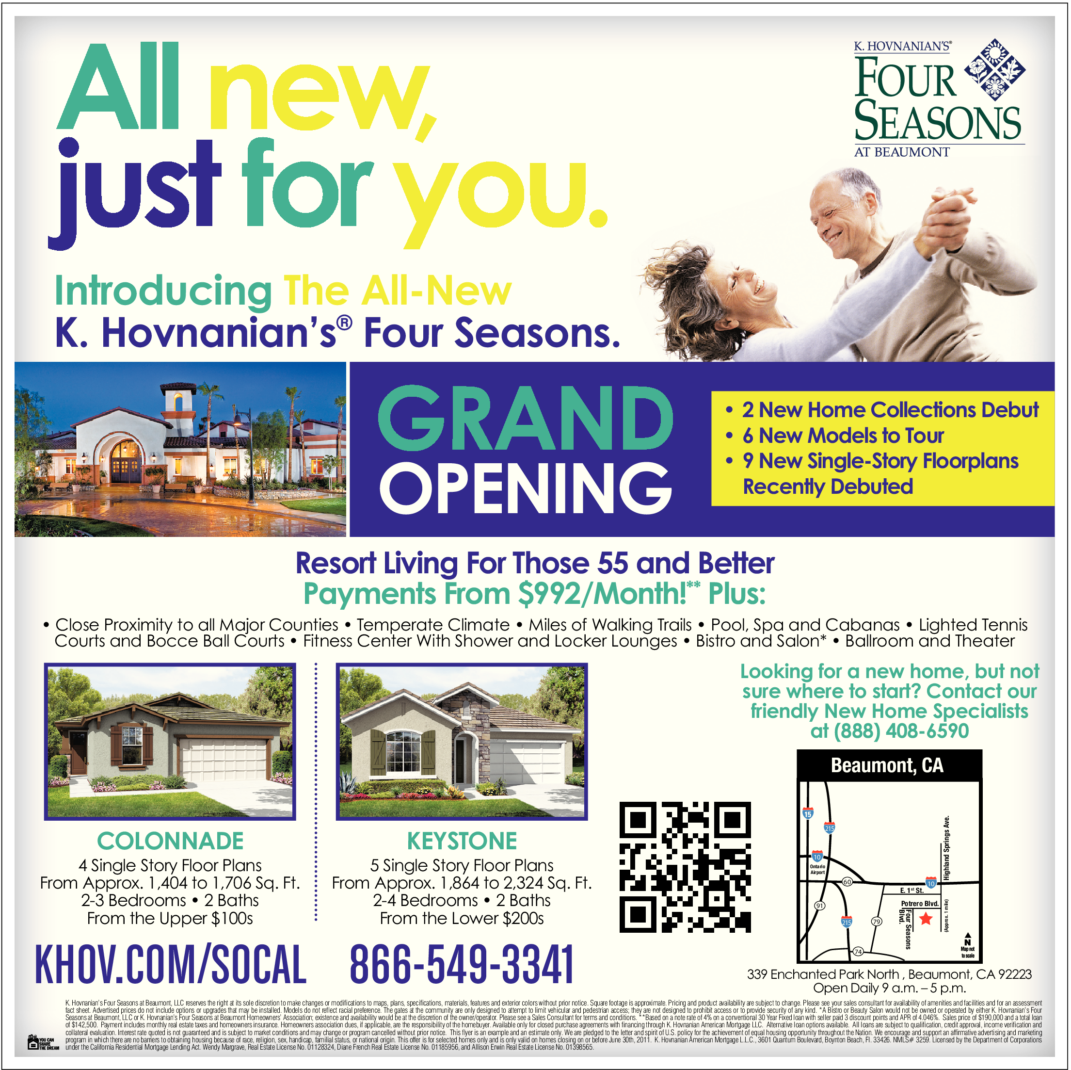 K. Hovnanian’s Four Seasons at Beaumont, LLC reserves the right at its sole discretion to make changes or modifications to maps, plans, specifications, materials, features and exterior colors without prior notice. Square footage is approximate. Pricing and product availability are subject to change. Please see your sales consultant for availability of amenities and facilities and for an assessment fact sheet. Advertised prices do not include options or upgrades that may be installed. Models do not reflect racial preference. The gates at the community are only designed to attempt to limit vehicular and pedestrian access; they are not designed to prohibit access or to provide security of any kind. *A Bistro or Beauty Salon would not be owned or operated by either K. Hovnanian’s Four Seasons at Beaumont, LLC or K. Hovnanian’s Four Seasons at Beaumont Homeowners’ Association; existence and availability would be at the discretion of the owner/operator. Please see a Sales Consultant for terms and conditions. **Based on a note rate of 4% on a conventional 30 Year Fixed loan with seller paid 3 discount points and APR of 4.046%. Sales price of $190,000 and a total loan of $142,500. Payment includes monthly real estate taxes and homeowners insurance. Homeowners association dues, if applicable, are the responsibility of the homebuyer. Available only for closed purchase agreements with financing through K. Hovnanian American Mortgage LLC. Alternative loan options available. All loans are subject to qualification, credit approval, income verification and collateral evaluation. Interest rate quoted is not guaranteed and is subject to market conditions and may change or program cancelled without prior notice. This flyer is an example and an estimate only. We are pledged to the letter and spirit of U.S. policy for the achievement of equal housing opportunity throughout the Nation. We encourage and support an affirmative advertising and marketing program in which there are no barriers to obtaining housing because of race, religion, sex, handicap, familial status, or national origin. This offer is for selected homes only and is only valid on homes closing on or before June 30th, 2011. K. Hovnanian American Mortgage L.L.C., 3601 Quantum Boulevard, Boynton Beach, Fl. 33426. NMLS# 3259. Licensed by the Department of Corporations under the California Residential Mortgage Lending Act. Wendy Margrave, Real Estate License No. 01128324, Diane French Real Estate License No. 01185956, and Allison Erwin Real Estate License No. 01398565.