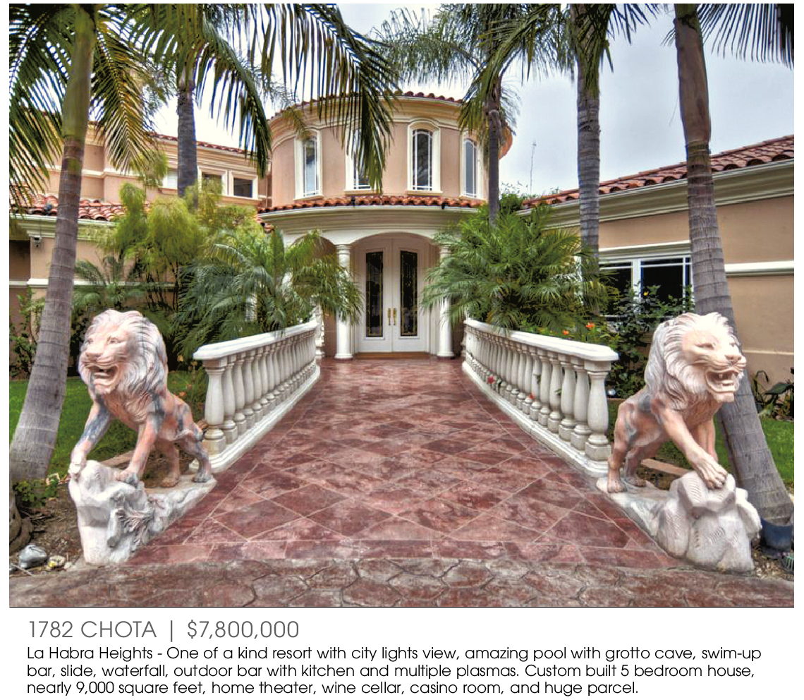 1782 CHOTA | $7,800,000 La Habra Heights - One of a kind resort with city lights view, amazing pool with grotto cave, swim-up bar, slide, waterfall, outdoor bar with kitchen and multiple plasmas. Custom built 5 bedroom house, nearly 9,000 square feet, home theater, wine cellar, casino room, and huge parcel.