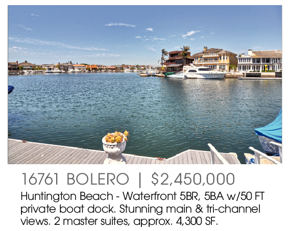 16761 BOLERO | $2,450,000 Huntington Beach - Waterfront 5BR, 5BA w/50 FT private boat dock. Stunning main & tri-channel views. 2 master suites, approx. 4,300 SF.
