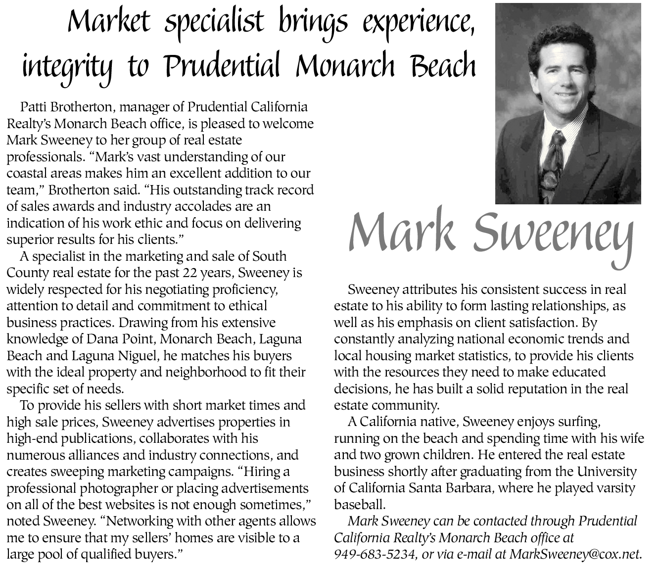 Mark Sweeney can be contacted through Prudential California Realty’s Monarch Beach office at 949-683-5234, or via e-mail at MarkSweeney@cox.net.
