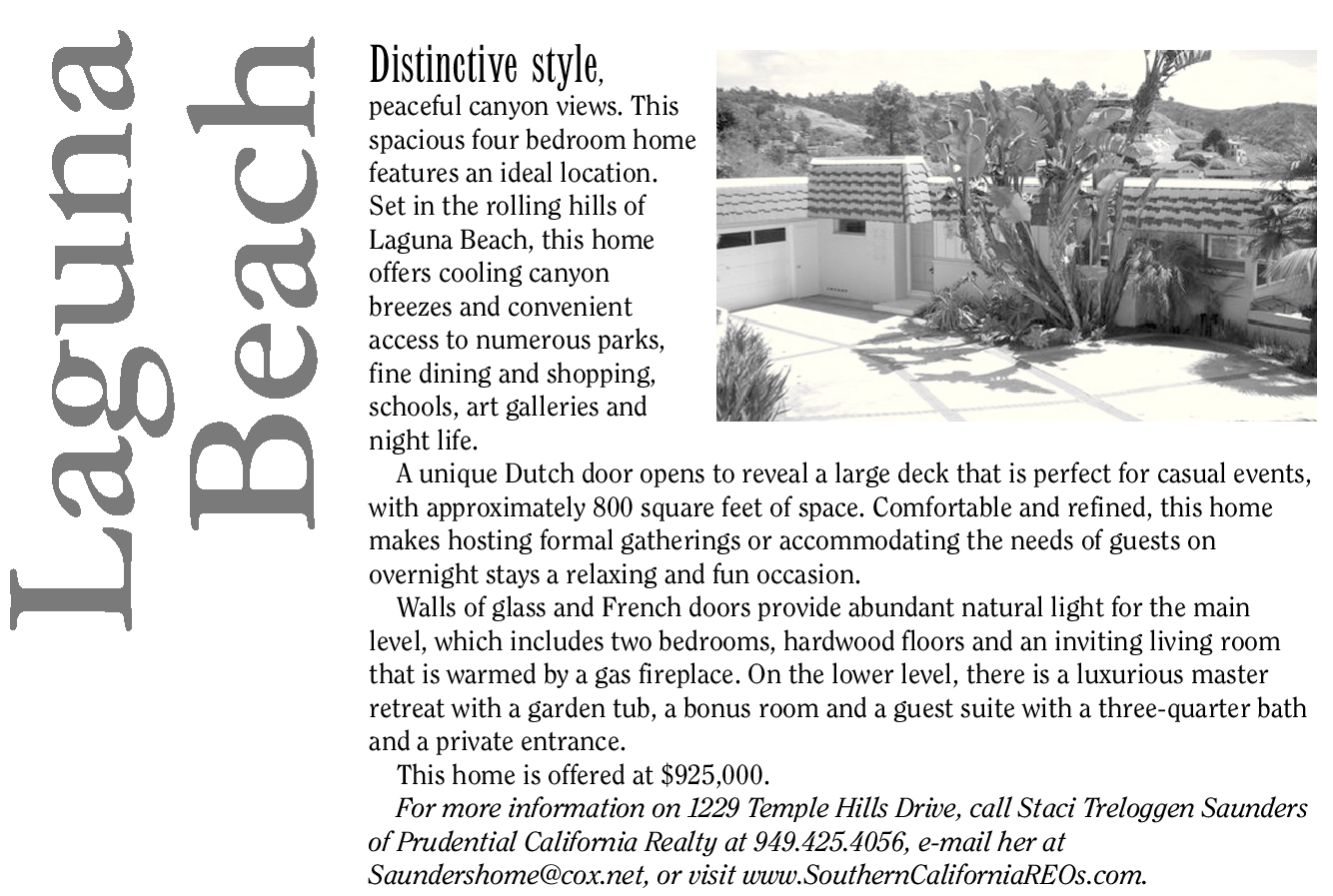 Distinctive style, peaceful canyon views. This spacious four bedroom home features an ideal location. Set in the rolling hills of Laguna Beach, this home offers cooling canyon breezes and convenient access to numerous parks, fine dining and shopping, schools, art galleries and night life. A unique Dutch door opens to reveal a large deck that is perfect for casual events, with approximately 800 square feet of space. Comfortable and refined, this home makes hosting formal gatherings or accommodating the needs of guests on overnight stays a relaxing and fun occasion. Walls of glass and French doors provide abundant natural light for the main level, which includes two bedrooms, hardwood floors and an inviting living room that is warmed by a gas fireplace. On the lower level, there is a luxurious master retreat with a garden tub, a bonus room and a guest suite with a three-quarter bath and a private entrance. This home is offered at $925,000. For more information on 1229 Temple Hills Drive, call Staci Treloggen Saunders of Prudential California Realty at 949.425.4056, e-mail her at Saundershome@cox.net, or visit www.SouthernCaliforniaREOs.com. See also