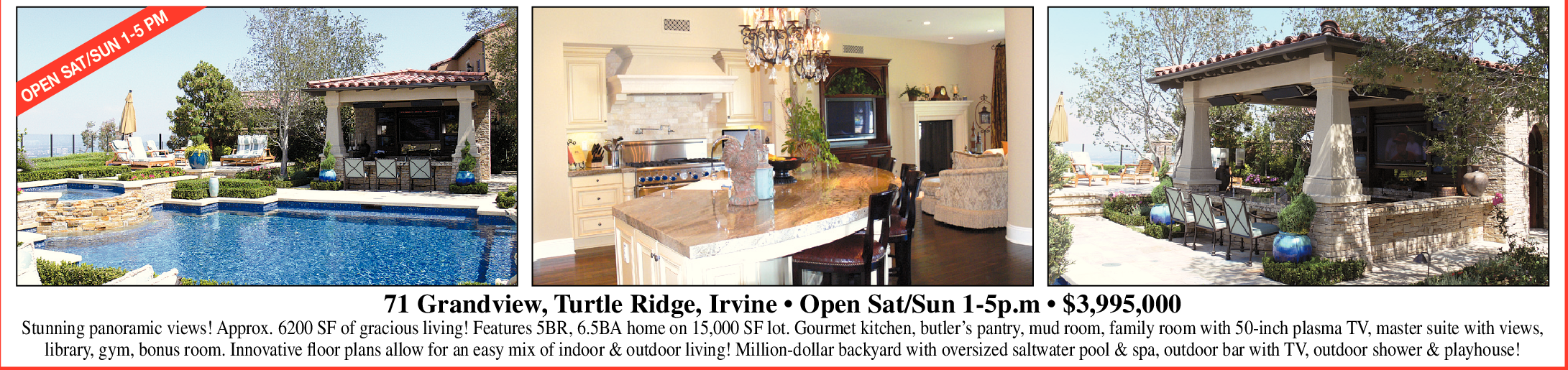 71 Grandview, Turtle Ridge, Irvine • Open Sat/Sun 1-5p.m • $3,995,000 Stunning panoramic views! Approx. 6200 SF of gracious living! Features 5BR, 6.5BA home on 15,000 SF lot. Gourmet kitchen, butler’s pantry, mud room, family room with 50-inch plasma TV, master suite with views, library, gym, bonus room. Innovative floor plans allow for an easy mix of indoor & outdoor living! Million-dollar backyard with oversized saltwater pool & spa, outdoor bar with TV, outdoor shower & playhouse!