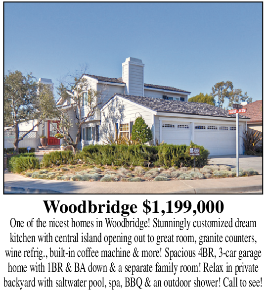 Woodbridge $1,199,000 One of the nicest homes in Woodbridge! Stunningly customized dream kitchen with central island opening out to great room, granite counters, wine refrig., built-in coffee machine & more! Spacious 4BR, 3-car garage home with 1BR & BA down & a separate family room! Relax in private backyard with saltwater pool, spa, BBQ & an outdoor shower! Call to see!