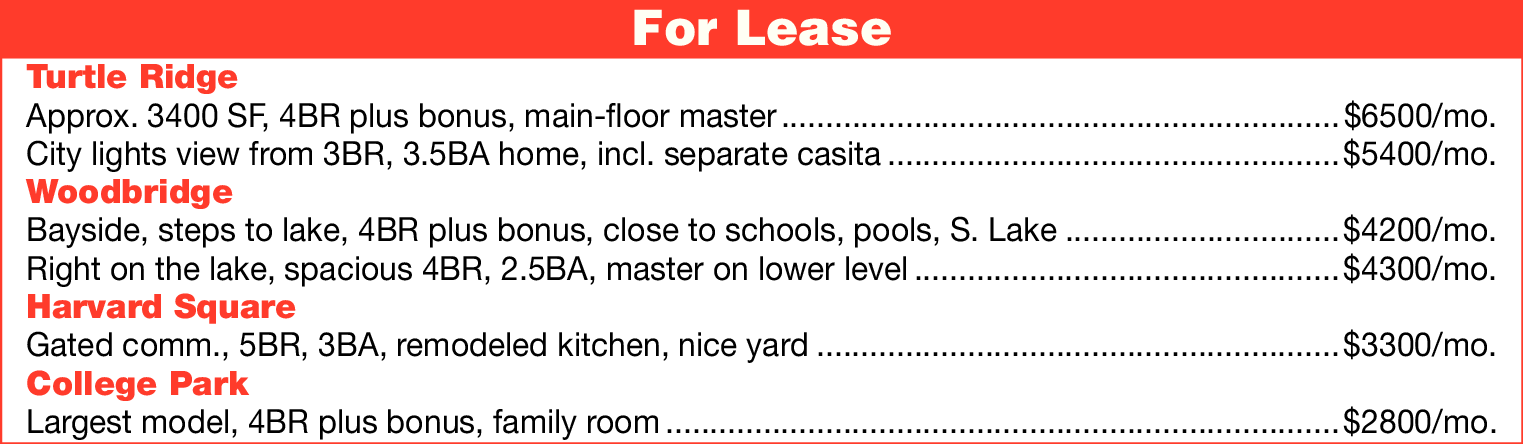 Turtle Ridge Approx. 3400 SF, 4BR plus bonus, main-floor master ...............................................................$6500/mo. City lights view from 3BR, 3.5BA home, incl. separate casita ...................................................$5400/mo. Woodbridge Bayside, steps to lake, 4BR plus bonus, close to schools, pools, S. Lake ...............................$4200/mo. Right on the lake, spacious 4BR, 2.5BA, master on lower level ................................................$4300/mo. Harvard Square Gated comm., 5BR, 3BA, remodeled kitchen, nice yard ...........................................................$3300/mo. College Park Largest model, 4BR plus bonus, family room ............................................................................$2800/mo.