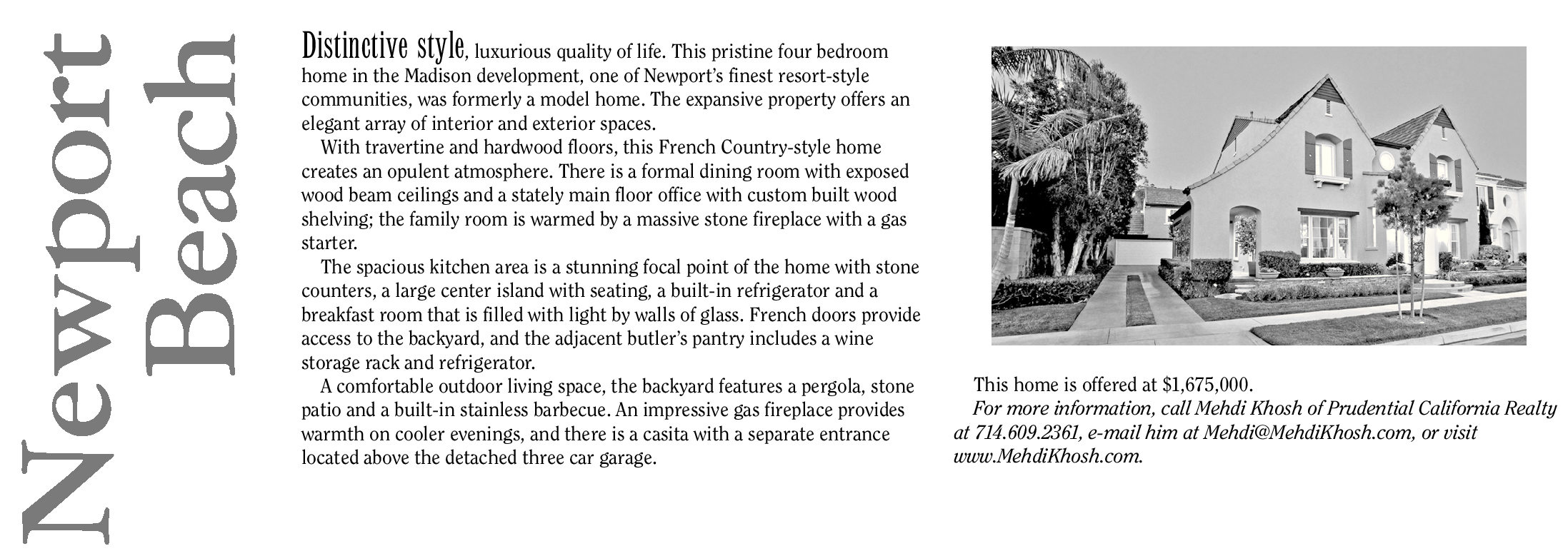 Distinctive style, luxurious quality of life. This pristine four bedroom home in the Madison development, one of Newport’s finest resort-style communities, was formerly a model home. The expansive property offers an elegant array of interior and exterior spaces. With travertine and hardwood floors, this French Country-style home creates an opulent atmosphere. There is a formal dining room with exposed wood beam ceilings and a stately main floor office with custom built wood shelving; the family room is warmed by a massive stone fireplace with a gas starter. The spacious kitchen area is a stunning focal point of the home with stone counters, a large center island with seating, a built-in refrigerator and a breakfast room that is filled with light by walls of glass. French doors provide access to the backyard, and the adjacent butler’s pantry includes a wine storage rack and refrigerator. A comfortable outdoor living space, the backyard features a pergola, stone patio and a built-in stainless barbecue. An impressive gas fireplace provides warmth on cooler evenings, and there is a casita with a separate entrance located above the detached three car garage. This home is offered at $1,675,000. For more information, call Mehdi Khosh of Prudential California Realty at 714.609.2361, e-mail him at Mehdi@MehdiKhosh.com, or visit www.MehdiKhosh.com. See also