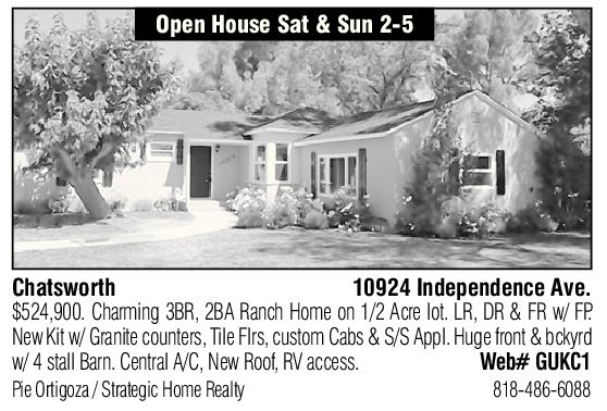 Chatsworth 10924 Independence Ave. New Kit w/ Granite counters, Tile Flrs, custom Cabs & S/S Appl. Huge front & bckyrd $524,900. Charming 3BR, 2BA Ranch Home on 1/2 Acre lot. LR, DR & FR w/ FP.