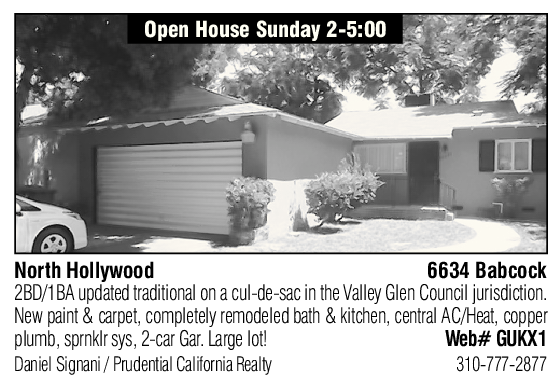North Hollywood 6634 Babcock 2BD/1BA updated traditional on a cul-de-sac in the Valley Glen Council jurisdiction. New paint & carpet, completely remodeled bath & kitchen, central AC/Heat, copper plumb, sprnklr sys, 2-car Gar. Large lot! Web# GUKX1 Daniel Signani / Prudential California Realty 310-777-2877