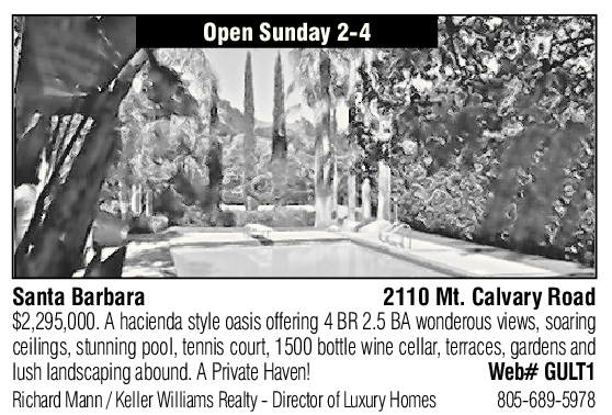 Santa Barbara 2110 Mt. Calvary Road $2,295,000. A hacienda style oasis offering 4 BR 2.5 BA wonderous views, soaring ceilings, stunning pool, tennis court, 1500 bottle wine cellar, terraces, gardens and lush landscaping abound. A Private Haven! Web# GULT1 Richard Mann / Keller Williams Realty - Director of Luxury Homes 805-689-5978