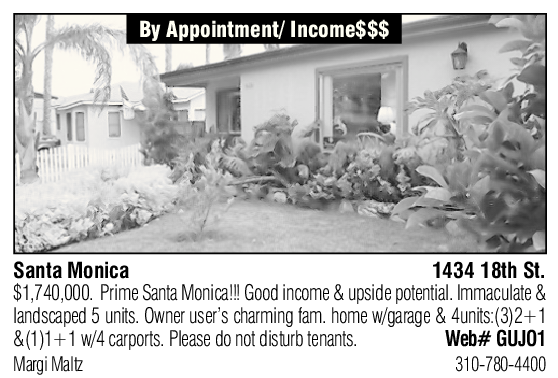 Santa Monica 1434 18th St. $1,740,000. Prime Santa Monica!!! Good income & upside potential. Immaculate & landscaped 5 units. Owner user’s charming fam. home w/garage & 4units:(3)2+1 &(1)1+1 w/4 carports. Please do not disturb tenants. Web# GUJO1 Margi Maltz 310-780-4400
