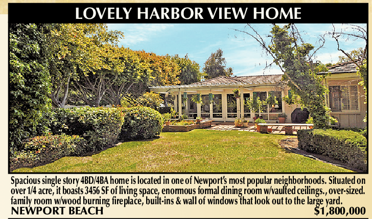 LOVELY HARBOR VIEW HOME Spacious single story 4BD/4BA home is located in one of Newport’s most popular neighborhoods. Situated on over 1/4 acre, it boasts 3456 SF of living space, enormous formal dining room w/vaulted ceilings., over-sized. family room w/wood burning fireplace, built-ins & wall of windows that look out to the large yard. NEWPORT BEACH $1,800,000