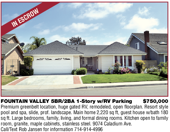 FOUNTAIN VALLEY 5BR/2BA 1-Story w/RV Parking $750,000 Premium greenbelt location, huge gated RV, remodeled, open floorplan. Resort style pool and spa, slide, prof. landscape. Main home 2,220 sq ft, guest house w/bath 180 sq ft. Large bedrooms, family, living, and formal dining rooms. Kitchen open to family room, granite, maple cabinets, stainless steel. 9074 Caladium Ave. Call/Text Rob Jansen for information 714-914-4996