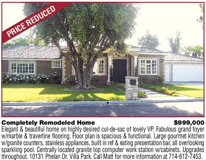Completely Remodeled Home $999,000 Elegant & beautiful home on highly desired cul-de-sac of lovely VP. Fabulous grand foyer w/marble & travertine flooring. Floor plan is spacious & functional. Large gourmet kitchen w/granite counters, stainless appliances, built in ref & eating presentation bar, all overlooking sparkling pool. Centrally located granite top computer work station w/cabinets. Upgrades throughout. 10131 Phelan Dr. Villa Park. Call Matt for more information at 714-612-7453.