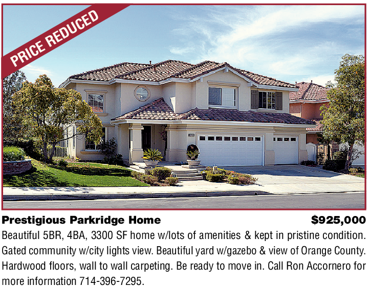 Prestigious Parkridge Home $925,000 Beautiful 5BR, 4BA, 3300 SF home w/lots of amenities & kept in pristine condition. Gated community w/city lights view. Beautiful yard w/gazebo & view of Orange County. Hardwood floors, wall to wall carpeting. Be ready to move in. Call Ron Accornero for more information 714-396-7295.