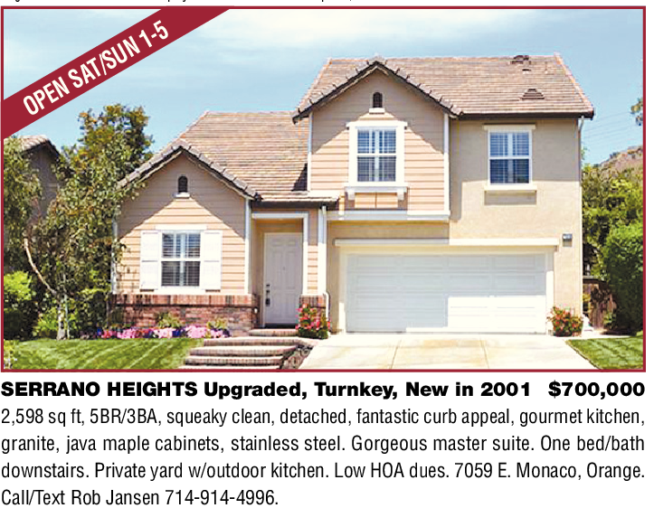 SERRANO HEIGHTS Upgraded, Turnkey, New in 2001 $700,000 2,598 sq ft, 5BR/3BA, squeaky clean, detached, fantastic curb appeal, gourmet kitchen, granite, java maple cabinets, stainless steel. Gorgeous master suite. One bed/bath downstairs. Private yard w/outdoor kitchen. Low HOA dues. 7059 E. Monaco, Orange. Call/Text Rob Jansen 714-914-4996.