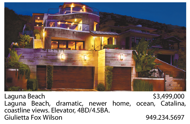Laguna Beach $3,499,000 Laguna Beach, dramatic, newer home, ocean, Catalina, coastline views. Elevator, 4BD/4.5BA. Giulietta Fox Wilson 949.234.5697