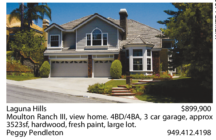 Laguna Hills $899,900 Moulton Ranch III, view home. 4BD/4BA, 3 car garage, approx 3523sf, hardwood, fresh paint, large lot. Peggy Pendleton 949.412.4198