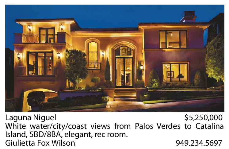 Laguna Niguel $5,250,000 White water/city/coast views from Palos Verdes to Catalina Island, 5BD/8BA, elegant, rec room. Giulietta Fox Wilson 949.234.5697