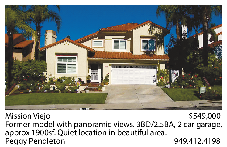 Mission Viejo $549,000 Former model with panoramic views. 3BD/2.5BA, 2 car garage, approx 1900sf. Quiet location in beautiful area. Peggy Pendleton 949.412.4198