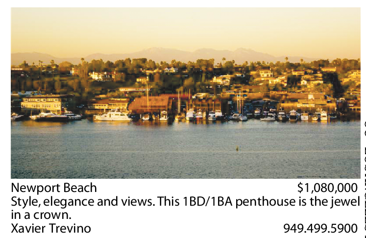 Newport Beach $1,080,000 Style, elegance and views. This 1BD/1BA penthouse is the jewel in a crown. Xavier Trevino 949.499.5900