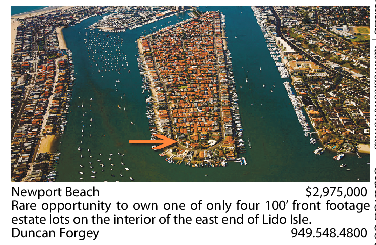 Newport Beach $2,975,000 Rare opportunity to own one of only four 100’ front footage estate lots on the interior of the east end of Lido Isle. Duncan Forgey 949.548.4800