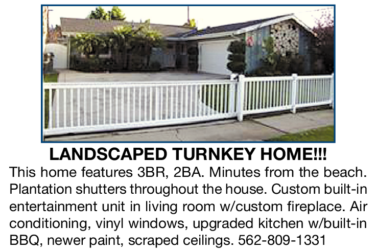 This home features 3BR, 2BA. Minutes from the beach. Plantation shutters throughout the house. Custom built-in entertainment unit in living room w/custom fireplace. Air conditioning, vinyl windows, upgraded kitchen w/built-in BBQ, newer paint, scraped ceilings. 562-809-1331