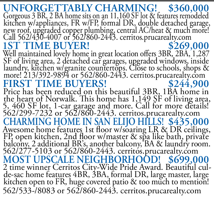 Call 562/430-4007 or 562/860-2443. cerritos.prucarealty.com 1ST TIME BUYER! $269,000 Well maintained lovely home in great location offers 3BR, 2BA, 1,287 SF of living area, 2 detached car garages, upgraded windows, inside laundry, kitchen w/granite countertops. Close to schools, shops & more! 213/392-9894 or 562/860-2443. cerritos.prucarealty.com FIRST TIME BUYERS! $244,900 Price has been reduced on this beautiful 3BR, 1BA home in the heart of Norwalk. This home has 1,149 SF of living area, 5, 460 SF lot, 1-car garage and more. Call for more details! 562/299-7232 or 562/860-2443. cerritos.prucarealty.com CHARMING HOME IN SAN ELIJO HILLS! $435,000 Awesome home features 1st floor w/soaring LR & DR ceilings, FP, open kitchen, 2nd floor w/master & spa like bath, private balcony, 2 additional BR’s, another balcony, BA & laundry room. 562/277-5103 or 562/860-2443. cerritos.prucarealty.com MOST UPSCALE NEIGHBORHOOD! $699,000 2 time winner Cerritos City-Wide Pride Award. Beautiful culde-sac home features 4BR, 3BA, formal DR, large master, large kitchen open to FR, huge covered patio & too much to mention!