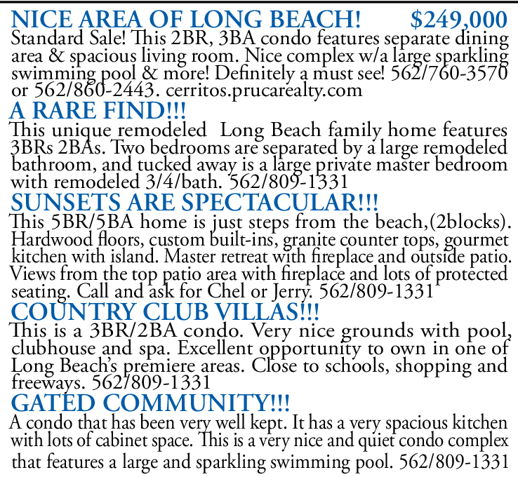 NICE AREA OF LONG BEACH! $249,000 Standard Sale! This 2BR, 3BA condo features separate dining area & spacious living room. Nice complex w/a large sparkling swimming pool & more! Definitely a must see! 562/760-3570 or 562/860-2443. cerritos.prucarealty.com A RARE FIND!!! This unique remodeled Long Beach family home features 3BRs 2BAs. Two bedrooms are separated by a large remodeled bathroom, and tucked away is a large private master bedroom with remodeled 3/4/bath. 562/809-1331 SUNSETS ARE SPECTACULAR!!!
