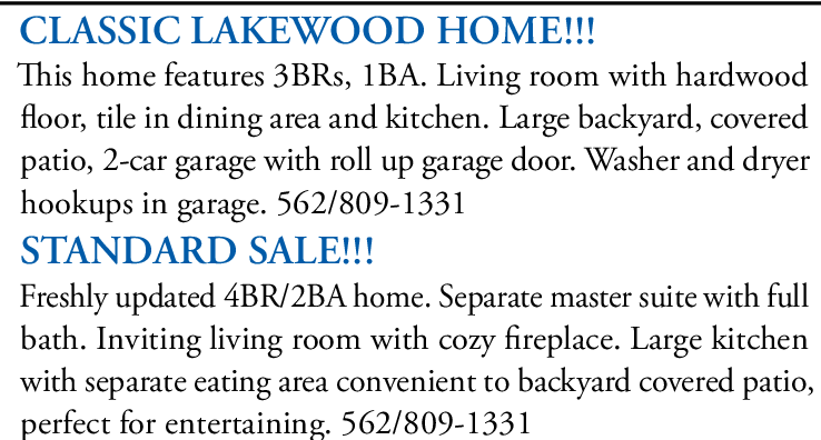 beach,(2blocks). patio. CLASSIC LAKEWOOD HOME!!! This home features 3BRs, 1BA. Living room with hardwood floor, tile in dining area and kitchen. Large backyard, covered patio, 2-car garage with roll up garage door. Washer and dryer hookups in garage. 562/809-1331 STANDARD SALE!!! Freshly updated 4BR/2BA home. Separate master suite with full bath. Inviting living room with cozy fireplace. Large kitchen with separate eating area convenient to backyard covered patio, perfect for entertaining. 562/809-1331
