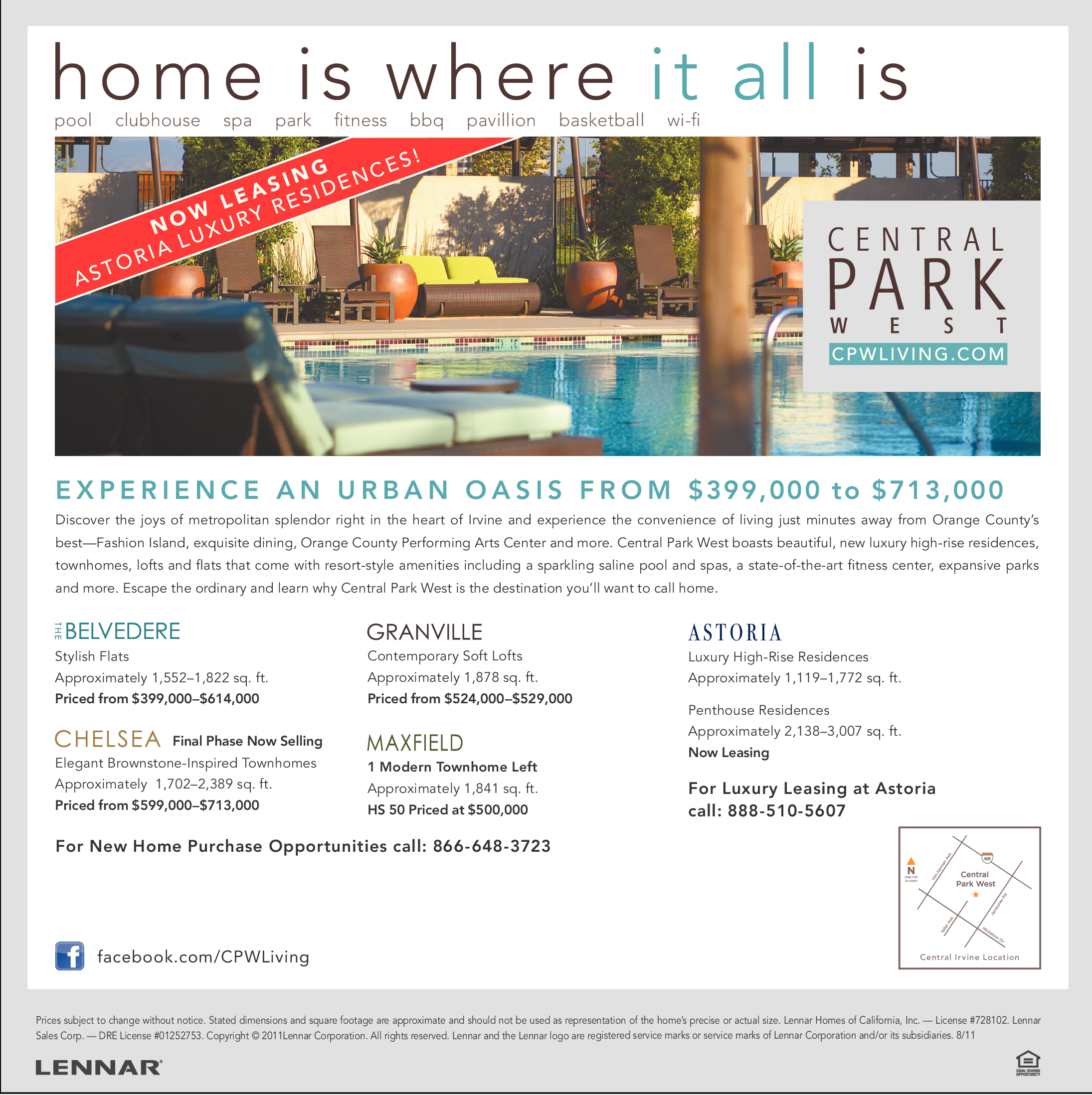 Discover the joys of metropolitan splendor right in the heart of Irvine and experience the convenience of living just minutes away from Orange County’s best—Fashion Island, exquisite dining, Orange County Performing Arts Center and more. Central Park West boasts beautiful, new luxury high-rise residences, townhomes, lofts and flats that come with resort-style amenities including a sparkling saline pool and spas, a state-of-the-art fitness center, expansive parks and more. Escape the ordinary and learn why Central Park West is the destination you’ll want to call home.
