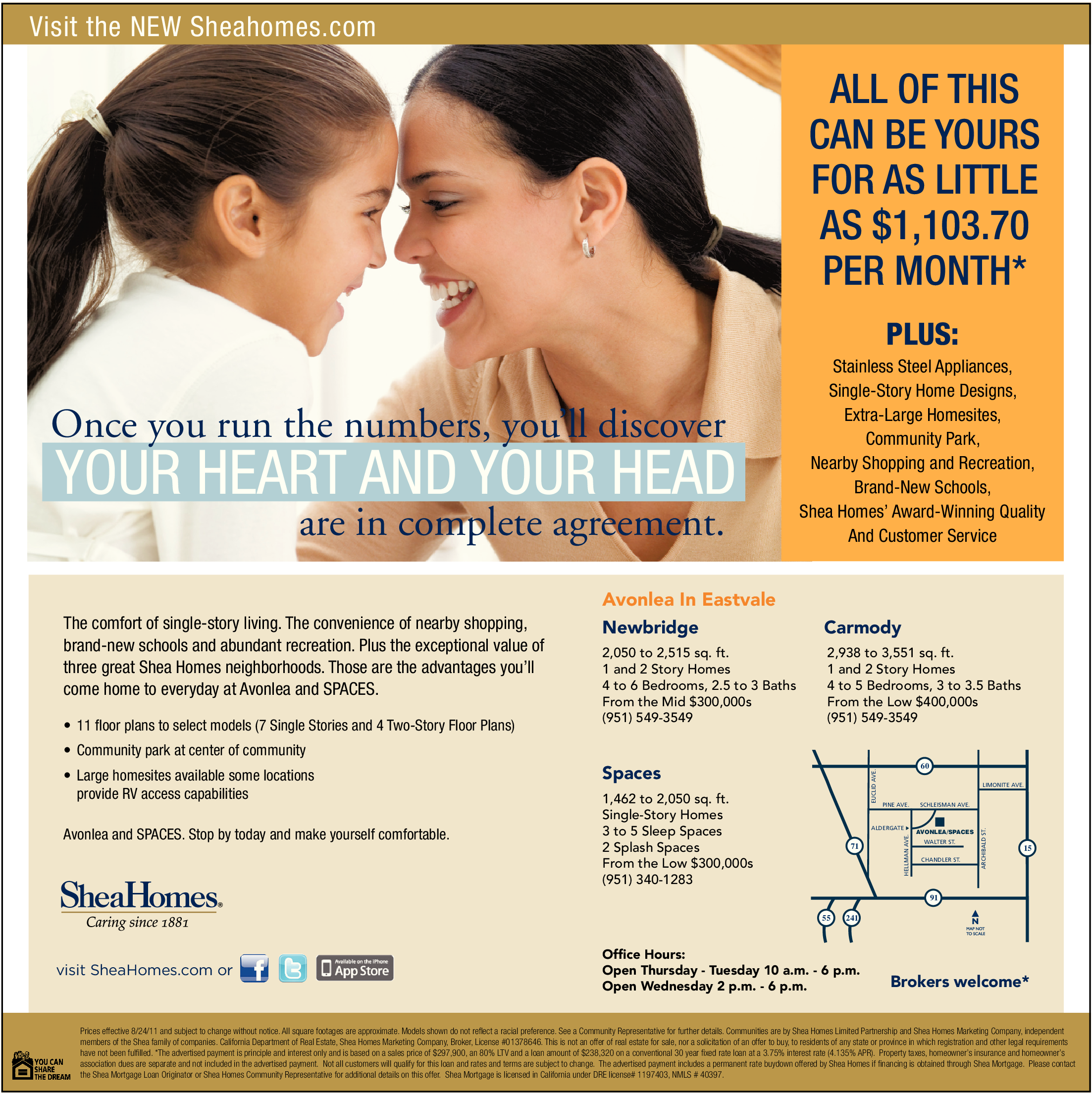 Prices effective 8/24/11 and subject to change without notice. All square footages are approximate. Models shown do not reflect a racial preference. See a Community Representative for further details. Communities are by Shea Homes Limited Partnership and Shea Homes Marketing Company, independent members of the Shea family of companies. California Department of Real Estate, Shea Homes Marketing Company, Broker, License #01378646. This is not an offer of real estate for sale, nor a solicitation of an offer to buy, to residents of any state or province in which registration and other legal requirements have not been fulfilled. *The advertised payment is principle and interest only and is based on a sales price of $297,900, an 80% LTV and a loan amount of $238,320 on a conventional 30 year fixed rate loan at a 3.75% interest rate (4.135% APR). Property taxes, homeowner’s insurance and homeowner’s association dues are separate and not included in the advertised payment. Not all customers will qualify for this loan and rates and terms are subject to change. The advertised payment includes a permanent rate buydown offered by Shea Homes if financing is obtained through Shea Mortgage. Please contact the Shea Mortgage Loan Originator or Shea Homes Community Representative for additional details on this offer. Shea Mortgage is licensed in California under DRE license# 1197403, NMLS # 40397.