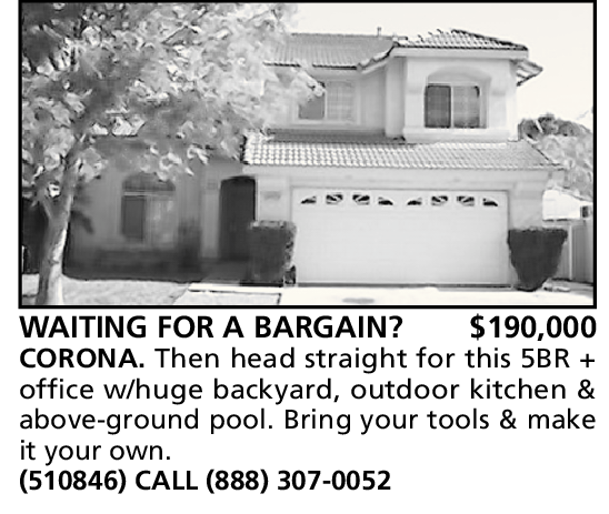 WAITING FOR A BARGAIN? $190,000 CORONA. Then head straight for this 5BR + office w/huge backyard, outdoor kitchen & above-ground pool. Bring your tools & make it your own. (510846) CALL (888) 307-0052