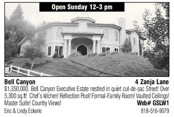 Open Sunday 12-3 pm Bell Canyon 4 Zanja Lane 5,300 sq.ft! Chef’s kitchen! Reflection Pool! Formal-Family Room! Vaulted Ceilings! $1,350,000. Bell Canyon Executive Estate nestled in quiet cul-de-sac Street! Over Master Suite! Country Views! Web# GSLW1 Eric & Lindy Eckerle 818-516-9079
