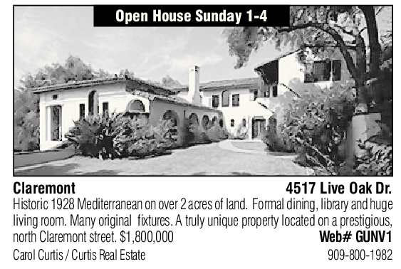 Claremont 4517 Live Oak Dr. living room. Many original fixtures. A truly unique property located on a prestigious, Historic 1928 Mediterranean on over 2 acres of land. Formal dining, library and huge north Claremont street. $1,800,000 Web# GUNV1 Carol Curtis / Curtis Real Estate 909-800-1982