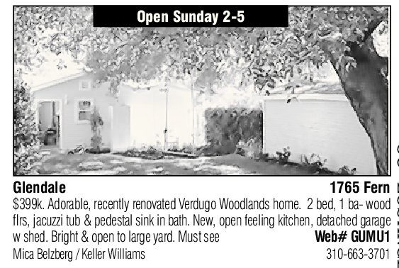Glendale 1765 Fern flrs, jacuzzi tub & pedestal sink in bath. New, open feeling kitchen, detached garage $399k. Adorable, recently renovated Verdugo Woodlands home. 2 bed, 1 ba- wood w shed. Bright & open to large yard. Must see Web# GUMU1 Mica Belzberg / Keller Williams 310-663-3701